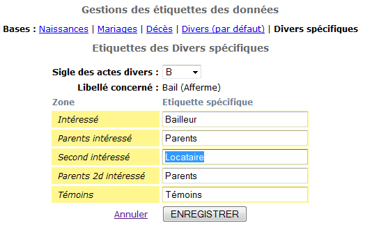 Le cinquième menu permet de modifier les étiquettes de groupes pour les actes divers selon le type de ces actes. La sélection du type s'effectue sur base du sigle associé à ce type d'actes.