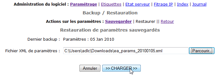 A cette fin, le menu "Paramètres > Backup" donne accès à un écran permettant de sauvegarder l'ensemble des paramètres dans un fichier XML et aussi de relire ce fichier et de modifier les paramètres courants avec ceux présents dans le fichier XML.